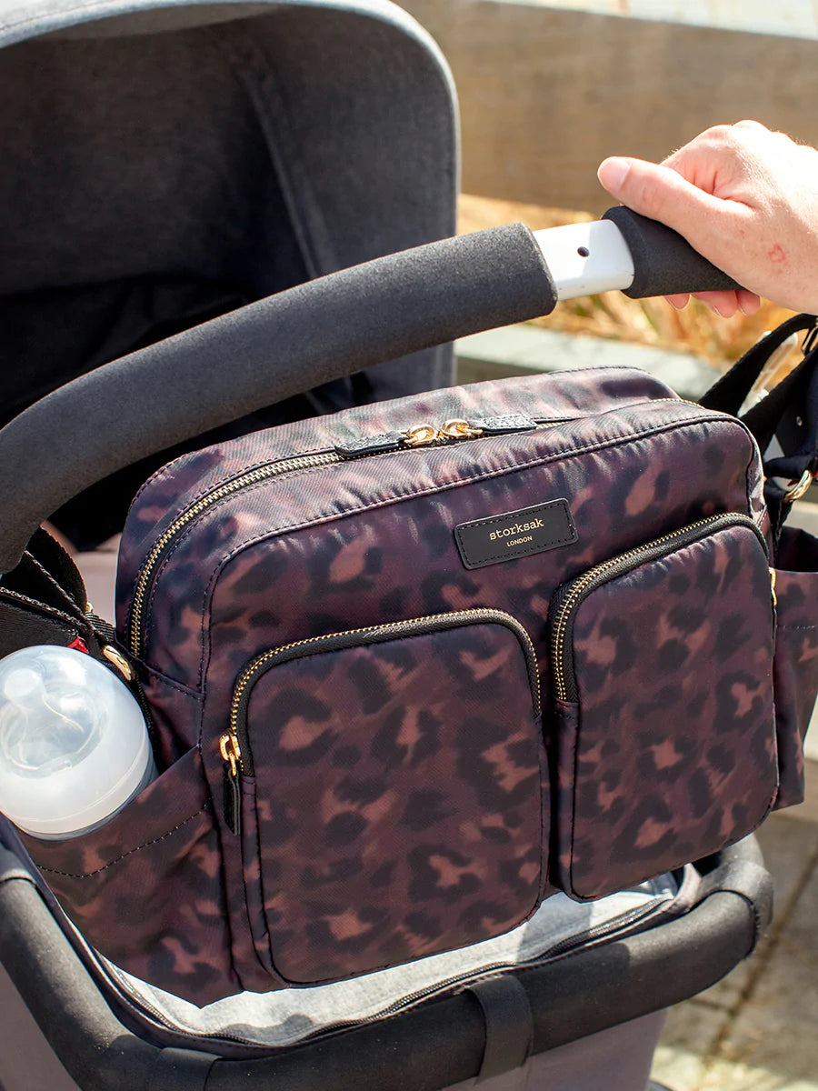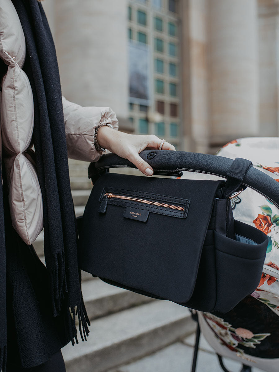 Our changing bags and accessories either include or are compatible with stroller clips or straps. You can usually find them as separate clips inside your changing bag, built-in to your long detachable strap or on the backpack straps. This handy feature is perfect for attaching your Storksak easily to your stroller.